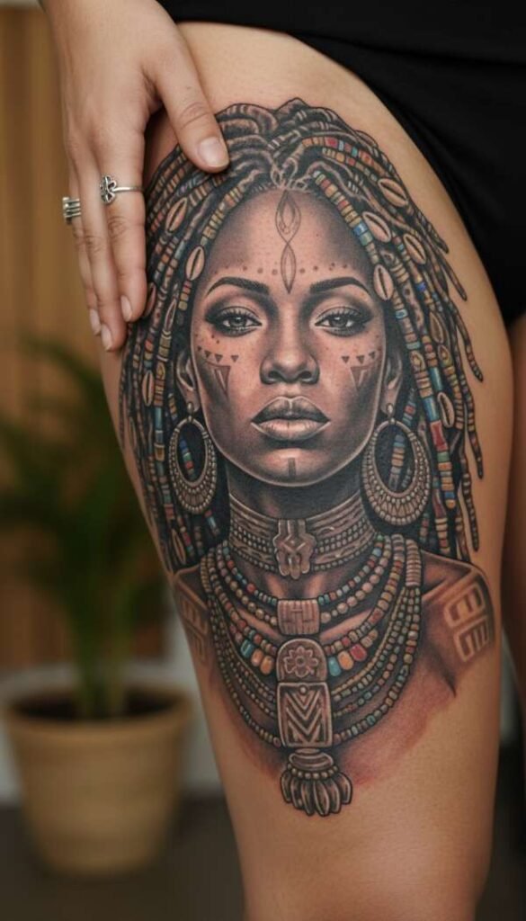 Beautiful African Tattoo Ideas can also celebrate femininity and matriarchal power. Goddess tattoos are absolutely breathtaking when executed by a talented portrait artist.