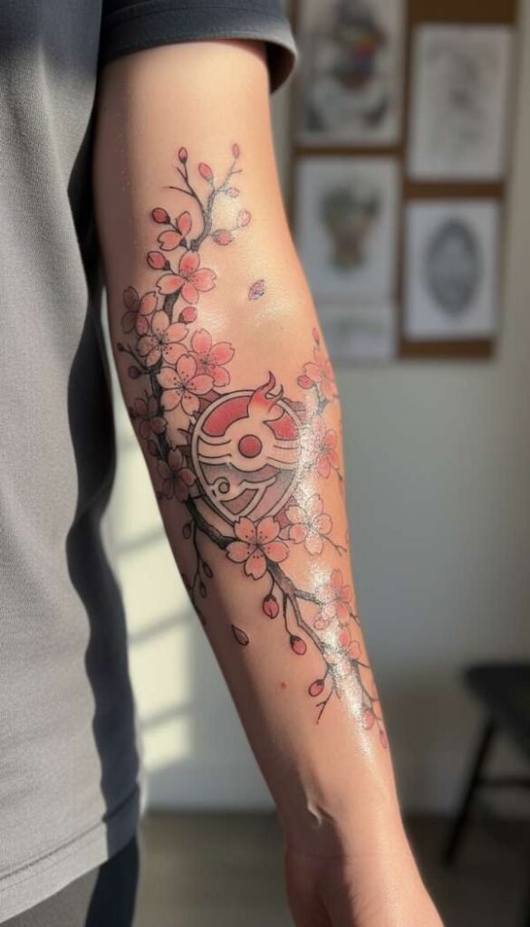 You do not have to stick rigidly to just one specific narrow aesthetic. Many creative people blend traditional Japanese elements like lovely cherry blossoms with their favorite characters. This beautiful fusion creates completely unique and highly personalized anime tattoo ideas.