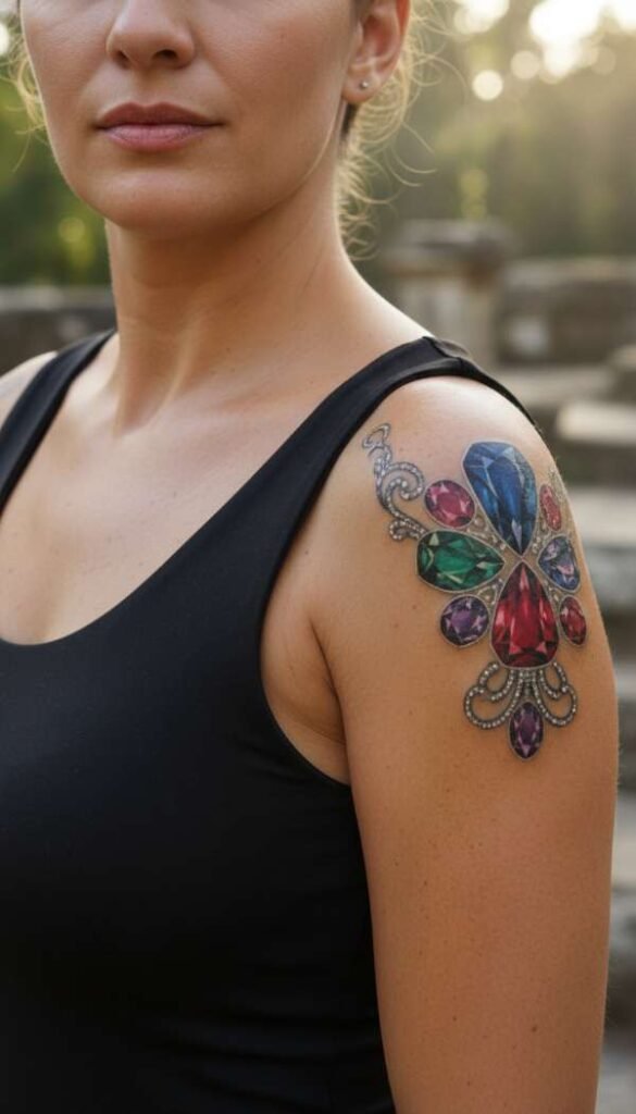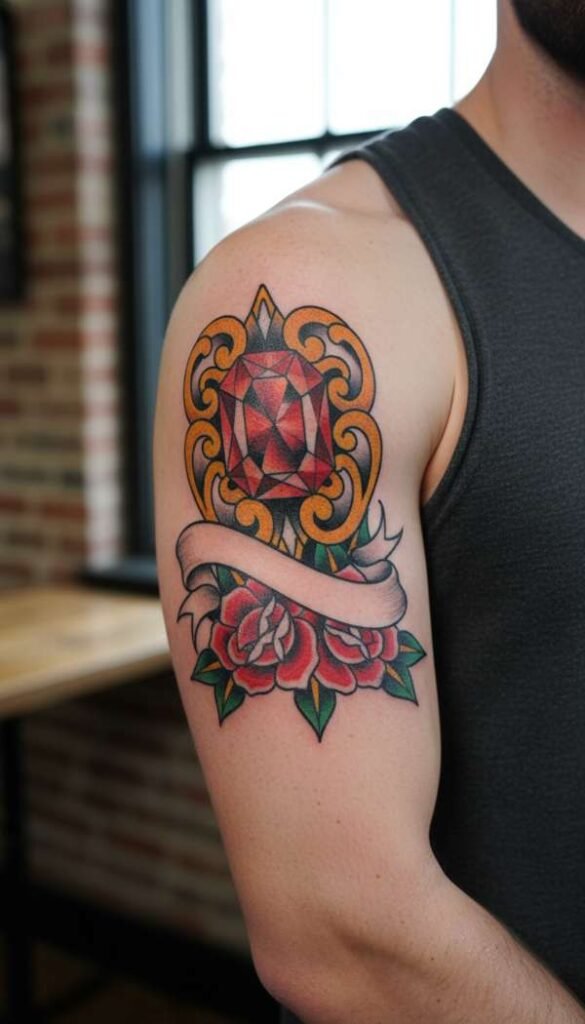 Old school designs often incorporate other classic elements like roses or swallows. Adding a banner with a meaningful word can make your traditional piece even more special. You might want to include words like family or strength alongside your sparkling gem.