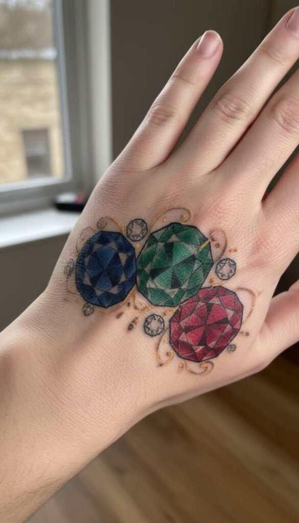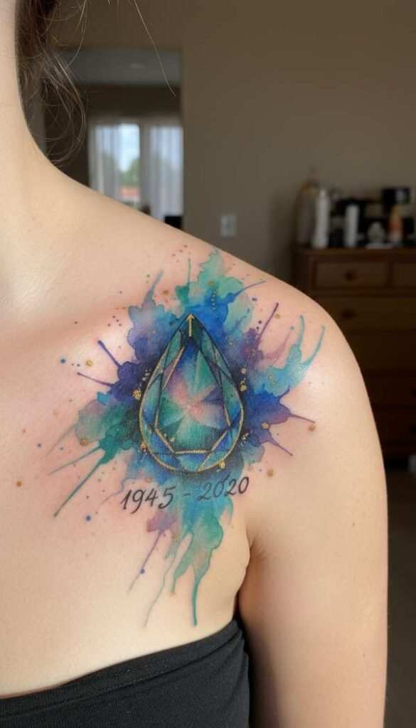 While black and grey designs are stunning, adding bright colors brings a completely different energy. A watercolor diamond tattoo uses splashes of vibrant ink to create a magical effect. This artistic approach makes the gem look like it is glowing right on your skin.