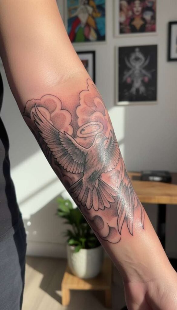 Strategic studio lighting plays a completely massive role in making your tattoo pop right off the canvas of your skin. Asking your artist to include bold geometric sun rays bursting through the clouds is an absolutely genius artistic move. It creates a majestic and heavily heavenly atmosphere that catches the human eye almost immediately from across any room.