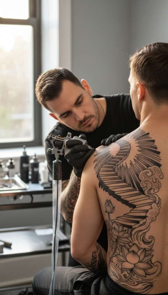 If you strongly prefer something slightly smaller and much more discreet, the outer bicep is a truly fantastic and highly visible option. Human thighs and lower calves also provide great vertical space for tall sweeping staircases or massive opening wooden doors. Always think deeply and carefully about exactly how visible you want your personal Heaven Tattoos to be on a daily basis.