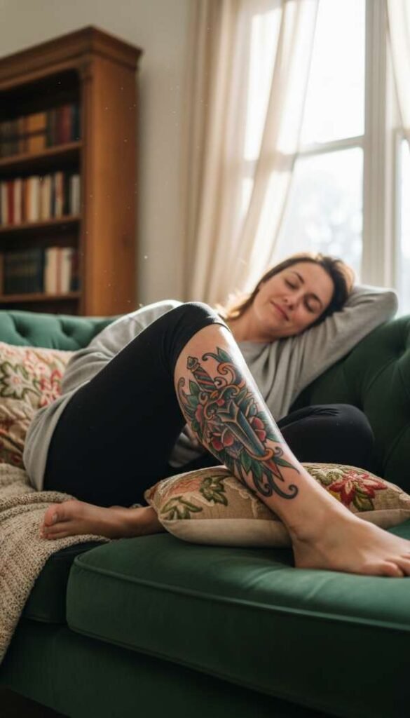 Keep your leg elevated on a pillow whenever you are resting on the couch. Icing the area indirectly can also help reduce the initial swelling. Following standard healing practices ensures your leg tattoo ideas stay crisp and vibrant.