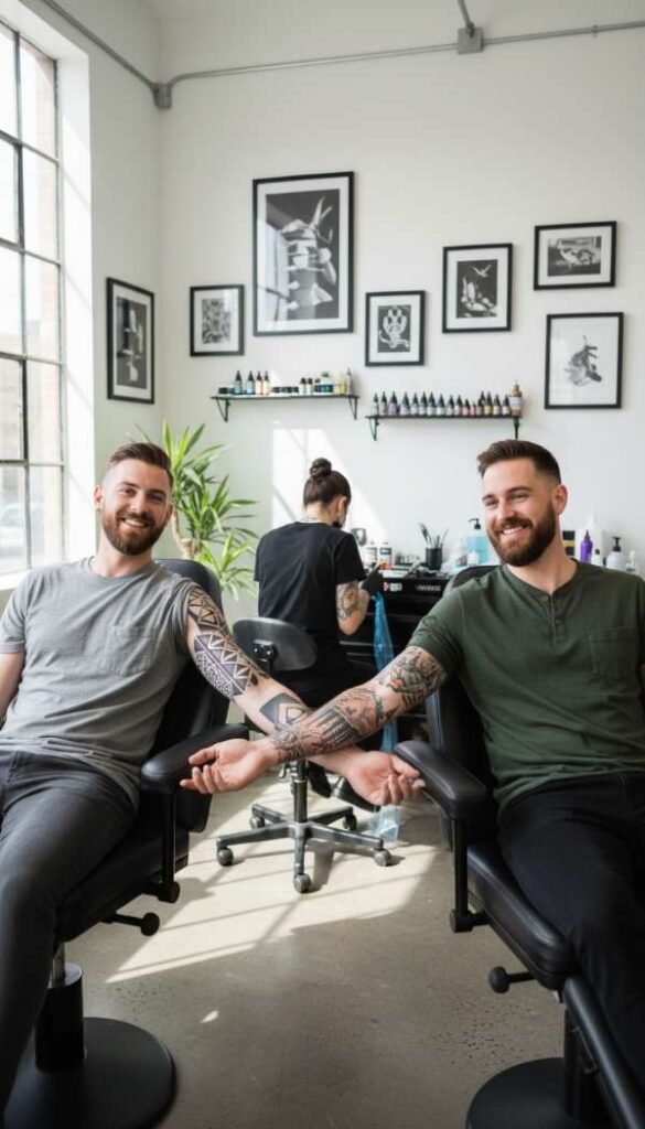 Sitting in the tattoo shop waiting room together creates an amazing atmosphere of excitement and beautiful nervous energy. Holding your sister or brother’s hand during the uniquely painful parts of the process builds extreme emotional trust. Experiencing a sibling tattoo session side by side is a profoundly beautiful memory you will deeply cherish forever.