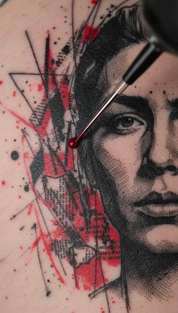 Another core element of the trash polka tattoo style is the collage effect. Artists blend perfect portraits with chaotic typewriter text. They often add random brush strokes and geometric shapes to complete the overall look.