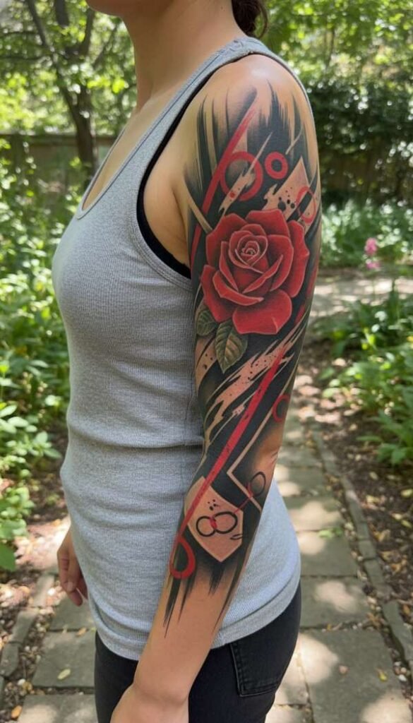 When these two techniques merge, the final result is absolutely breathtaking. You might see a beautifully shaded rose being pierced by jagged red lines. It perfectly represents the clash between peaceful nature and manmade destruction.