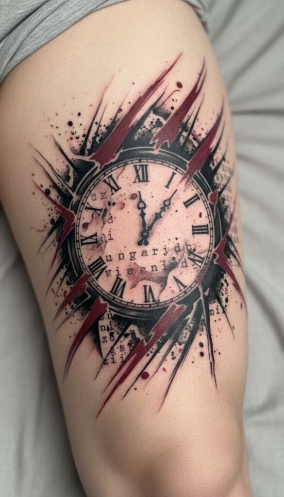 Many designs also incorporate heavy themes of time or mortality. It is very common to see clocks, skulls, and ravens mixed into the chaos. These symbols add a deep psychological layer to the artwork.
